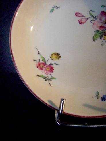 Bouquet de fleurs polychromes décentré et rappel de fleurs et fleurettes. Le bord est souligné d’un liseret pourpre. Marque en creux « D3 ». Diamètre de 13,5 cm. Très bon état.