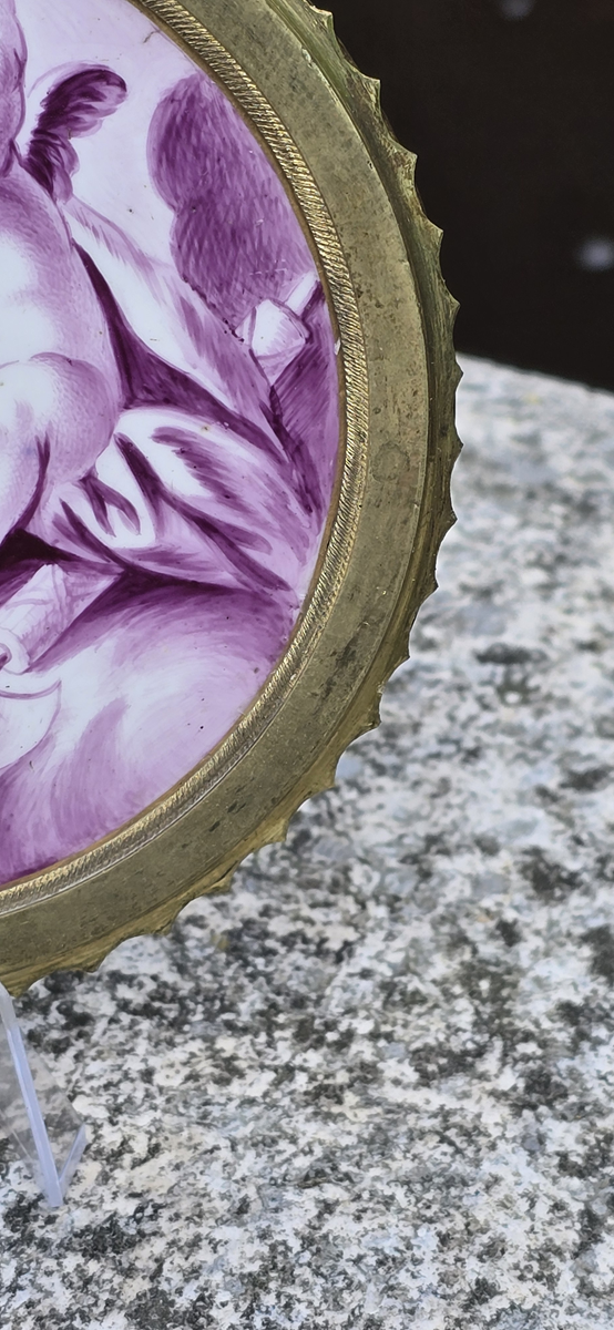 Rare plaque de meuble en porcelaine de Tournai 18ème, décor en camaïeu pourpre des amours de Boucher, le bord est souligné par un peigné or.